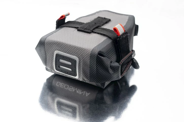 Sadeltasken monteres med velcro på sadelpind og sadel og kan benyttes til opbevaring af ekstra slange, samt dækjern og patroner.