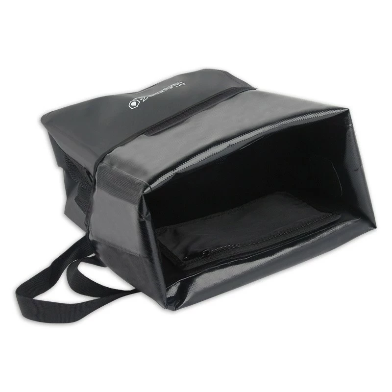 Tasken er lavet i et 100% vandtæt materiale med en lynlås indvendigt samt velcro på toppen.