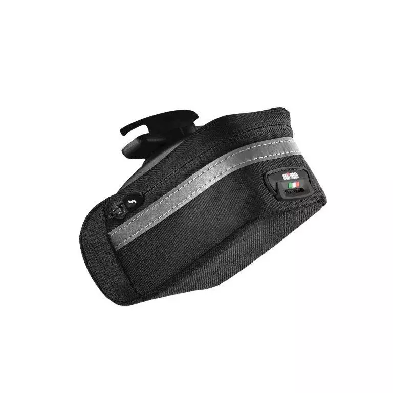 Smart kompakt sadeltaske i minimalistisk design med reflekterende stribe.