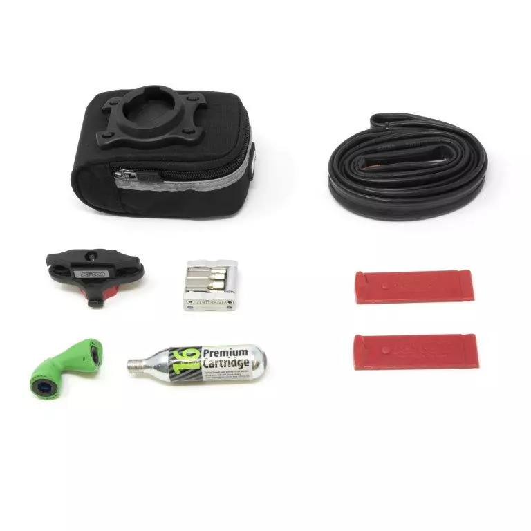 Med i sadeltasken kommer der 2 hærdede dækjern, og der er stadig plads til en slange og en Co2 patron.